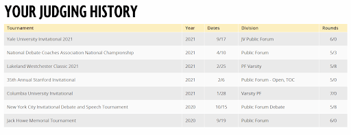 Not only have HYPE’s leaders helped coach students in debate, but they have also served as free judges, especially in Urban Debate Leagues, which are primarily for students from impoverished backgrounds in metropolitan areas. In order to enter debate tournaments, there is frequently a requirement that mandates students to Many of HYPE’s leaders have dedicated entire weekends to judging for these students at state and national level debate tournaments, providing $3,150 (26 rounds) worth of free judging to support these students. Shown below are the judging records for just two of our leaders.